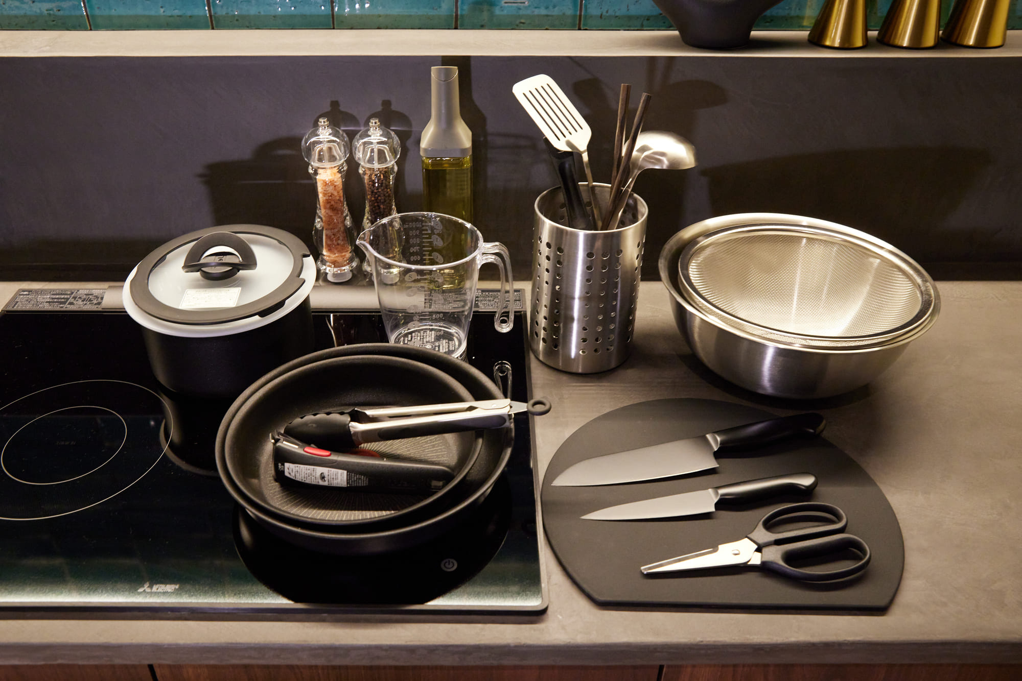 調理器具:鍋、フライパン、フライ返し、菜箸、お玉、ワインオープナー、包丁、まな板、ピーラー